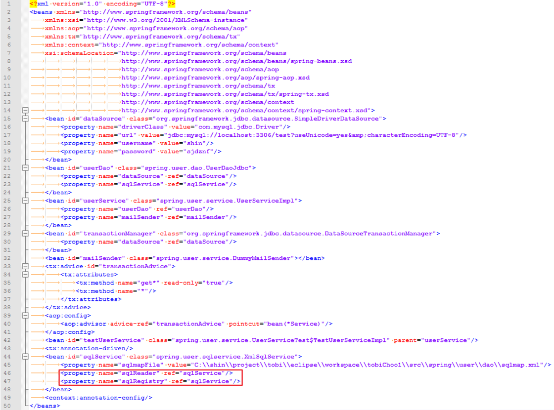 46. 스프링은 프로퍼티 ref 항목에 자기 자신을 넣는 것을 허용한다. 이를 통해 sqlService를 구현한 메소드와 초기화 메소드는 외부에서 DI된 오브젝트라고 생각하고 결국 자신의 메소드에 접근한다. (자기참조빈)