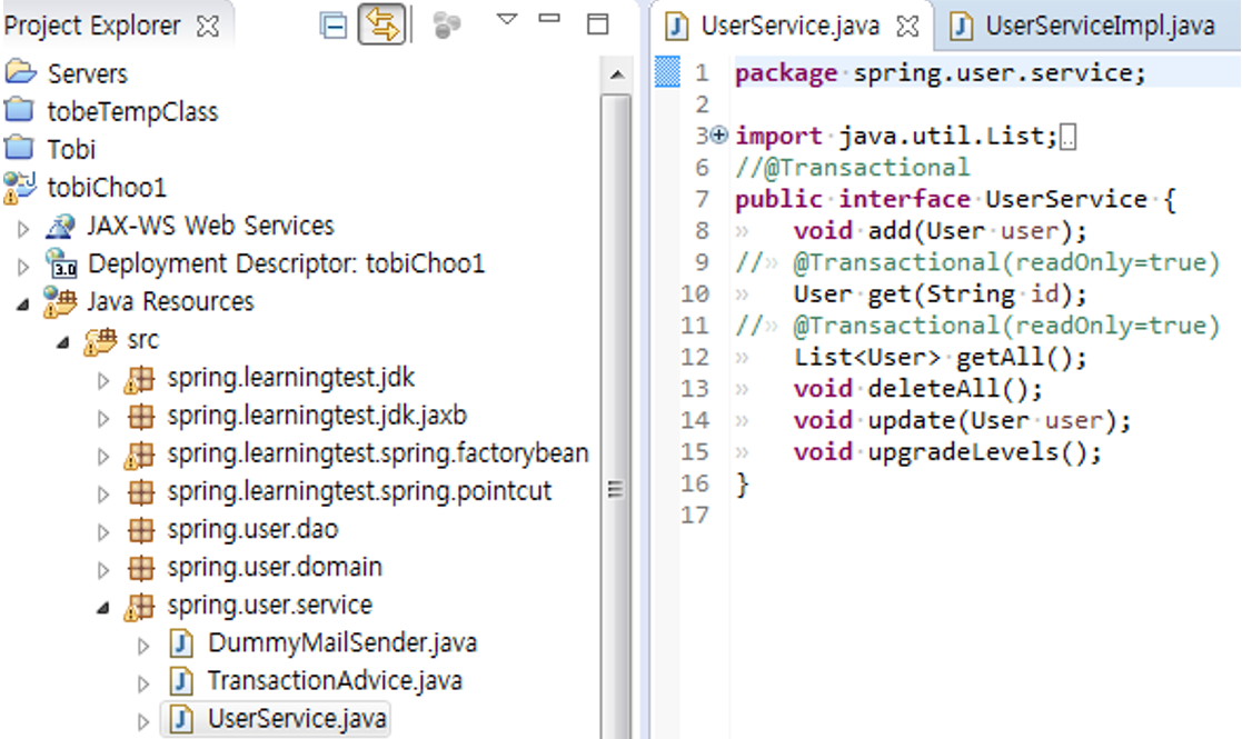 > 예를 들어 UserService가 아니라면 UserDao를 직접 사용하지 않고, UserService를 사용하는 것이 바람직하다. 단순 조회나 간단한 수정이라면 직접 UserService외의 서비스 계층 오브젝트에서 UserDao를 사용해도 상관없다. 하지만 등록이나 수정, 삭제가 포함된 작업이라면 다른 모듈의 DAO를 직접 이용할 때 신중을 기해야 한다. 안전하게 사용하려면 다른 모듈의 서비스 계층을 통해 접근하는 방법이 좋다.(트랜잭션 모두 취소 혹은 모두 성공)