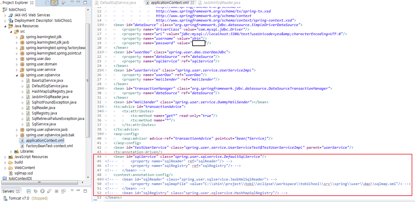 43, 44. 이제 프로퍼티의 DI를 통해 의존관계를 자유롭게 변경해가면서 기능을 확장할 수 있다. 유연해짐. 하지만, 반대로 적어도 3개의 빈을 등록해줘야 한다는 점이 귀찮게 느껴지기도 한다. 앞으로 클래스가 계속 늘어날텐데 의존관계 설정에 대한 부담을 감수해야 한다. 설령 한동안은 JAXB를 사용하는 SqlReader와 HashMap으로 저장해두는 SqlRegistry를 사용할 것이 분명하다고 해도 말이다.
