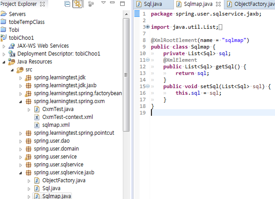 30. 추상 인터페이스인 Unmarshaller의 unmarshal() 메소드를 한번 호출해 주기만 하면 모든 번거로운 작업은 Jaxb2Marshaller 빈이 알아서 진행해줄 것이다. XML을 읽어 오브젝트로 변환하는 것은 두 줄이면 충분하다. Source 타입으로 가져올 파일을 지정하는 것 하나와 Unmarshaller 오브젝트의 unmarshal() 메소드를 호출하는 것이 전부다. 변수선언을 없애고 한줄로도 가능.