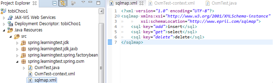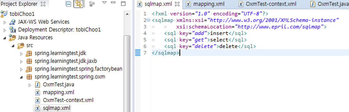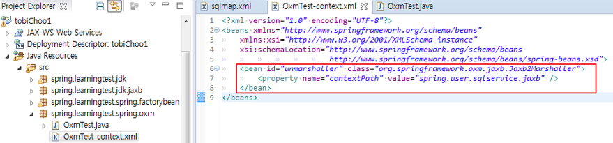 7. Jaxb2Marshaller 빈에는 바인딩 클래스(JAXB domain)의 패키지 이름을 지정하는 프로퍼티인 contextPath만 넣어주면 된다.