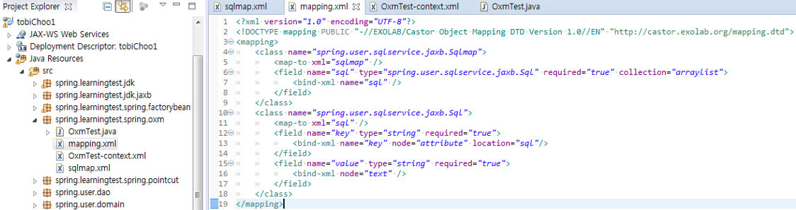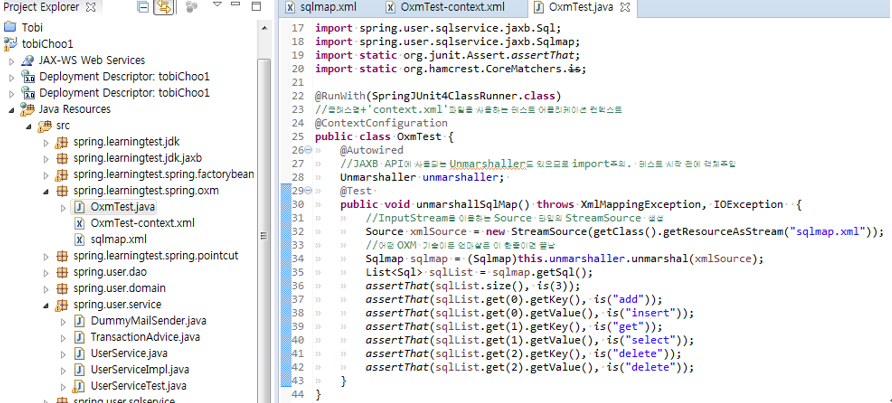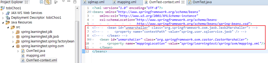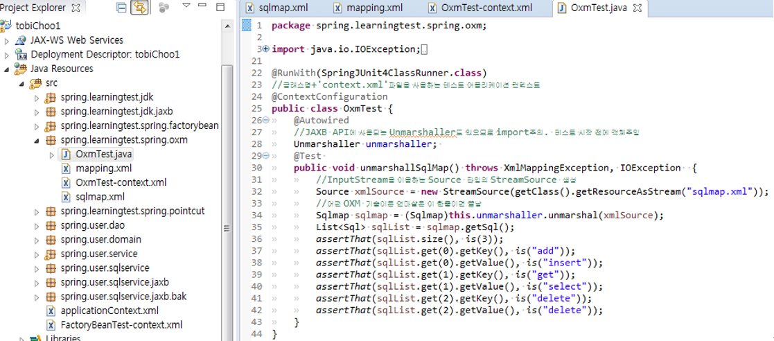 * 따라서 OXM 기술을 JAXB가 아닌 다른 것으로 바꿔야할 경우 테스트 코드 수정없이 XML 빈 설정만 변경해주면 된다.