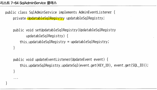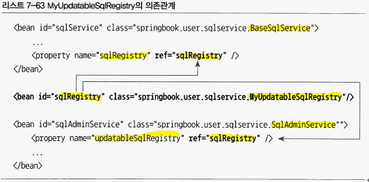 반면에 SQL 업데이트 작업이 필요한 새로운 클라이언트 오브젝트는 UpdatableSqlRegistry 인터페이스를 통해 SQL 레지스트리 오브젝트에 접근하도록 만들어야 한다.