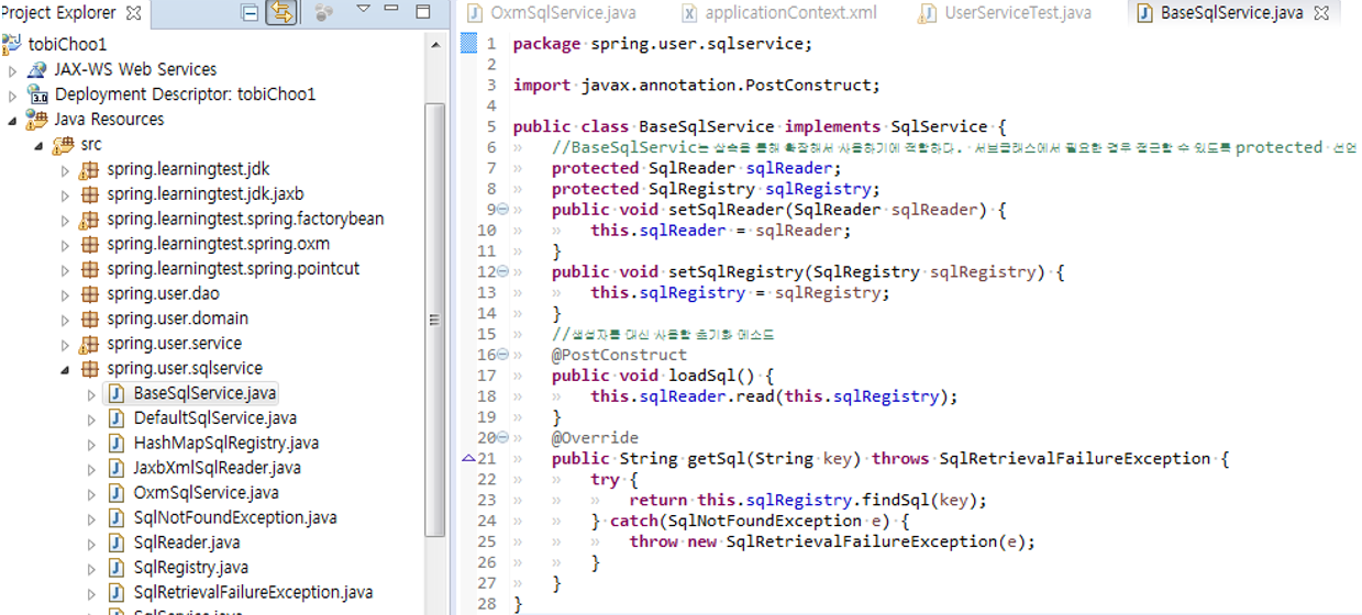 > 여태 코딩해온 SqlService의 기본 구현인 BaseSqlService 클래스의 설계구조를 살펴보자.