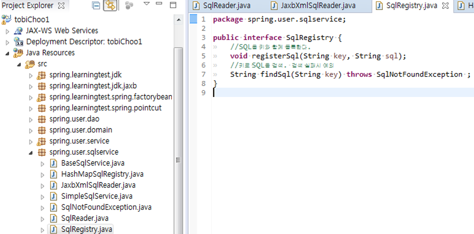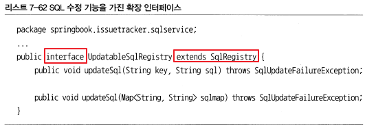 새로운 클라이언트가 필요로 하는 인터페이스는 SQL에 대한 수정을 요청할 수 있는 메소드를 갖고 있어야 하며, 등록이나 검색 같은 기본적인 기능도 필요할 테니 기존 SqlRegistry 인터페이스에 정의된 메소드도 사용할 필요가 있다. 그렇다면 새로운 클라이언트를 위한 인터페이스에 정의된 메소드도 사용할 필요가 있다. 그렇다면 새로운 클라이언트를 위한 인터페이스는 SqlRegistry 인터페이스의 기능과 함께 새로운 SQL 수정 기능도 갖고 있어야 한다.